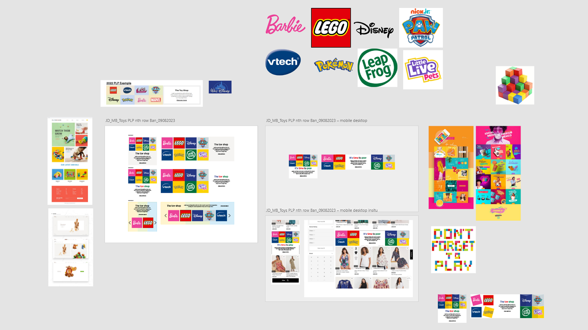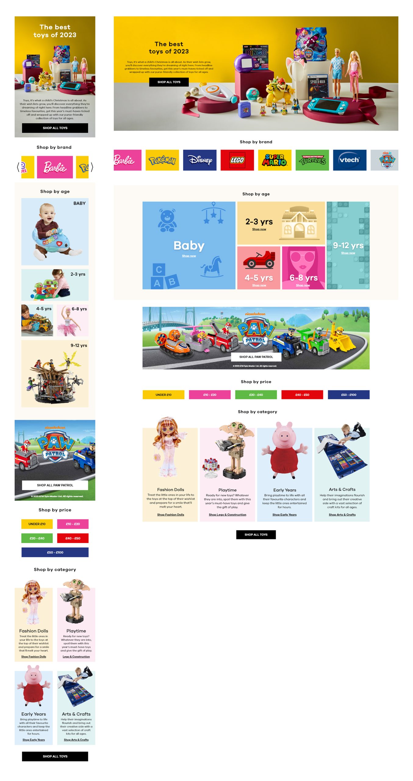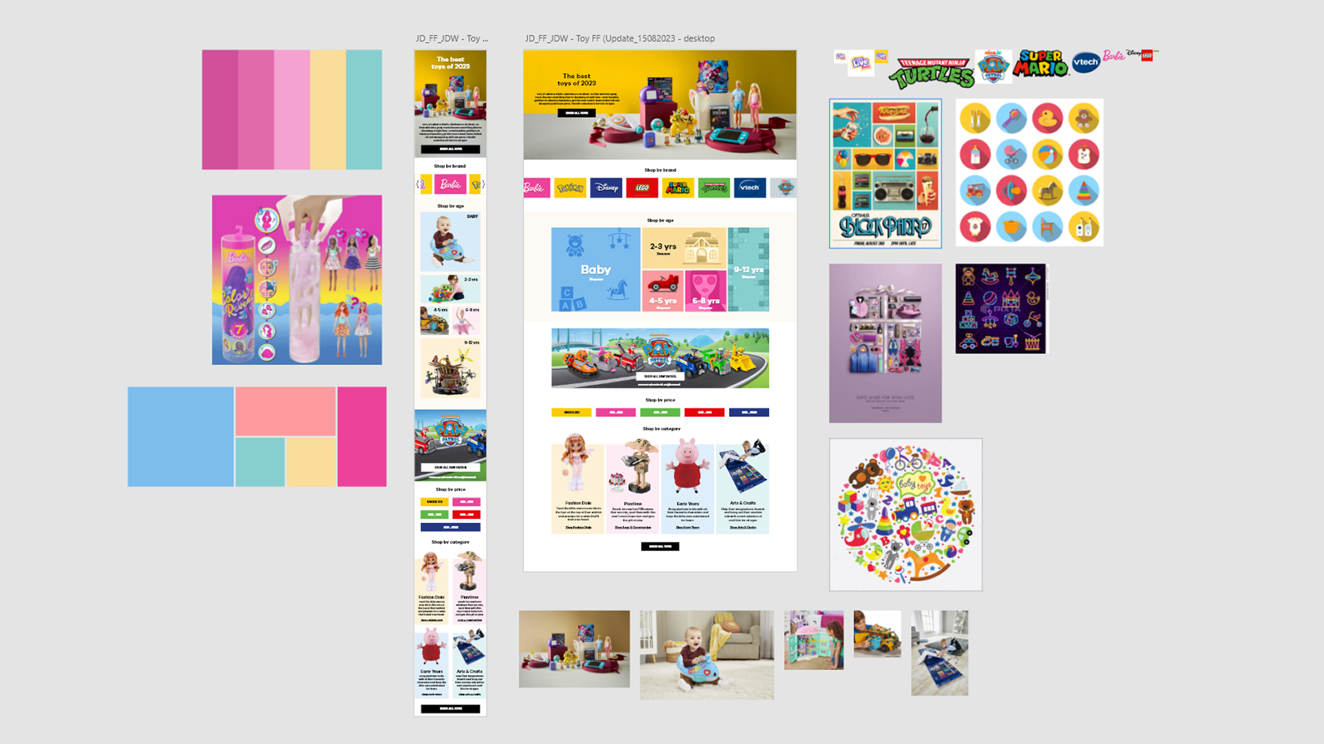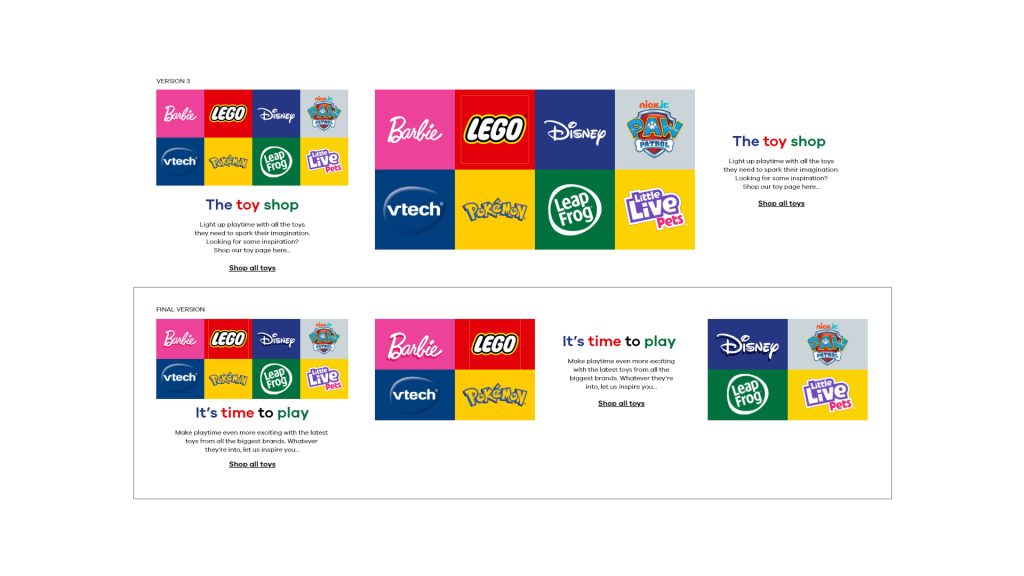 Conducted a competitive audit of leading toy retailers to identify industry standards for navigation and product discovery. Applied these insights to design campaign pages and window banners, ensuring all creative assets—including licensed content for Paw Patrol—met strict brand guidelines and typographic standards.