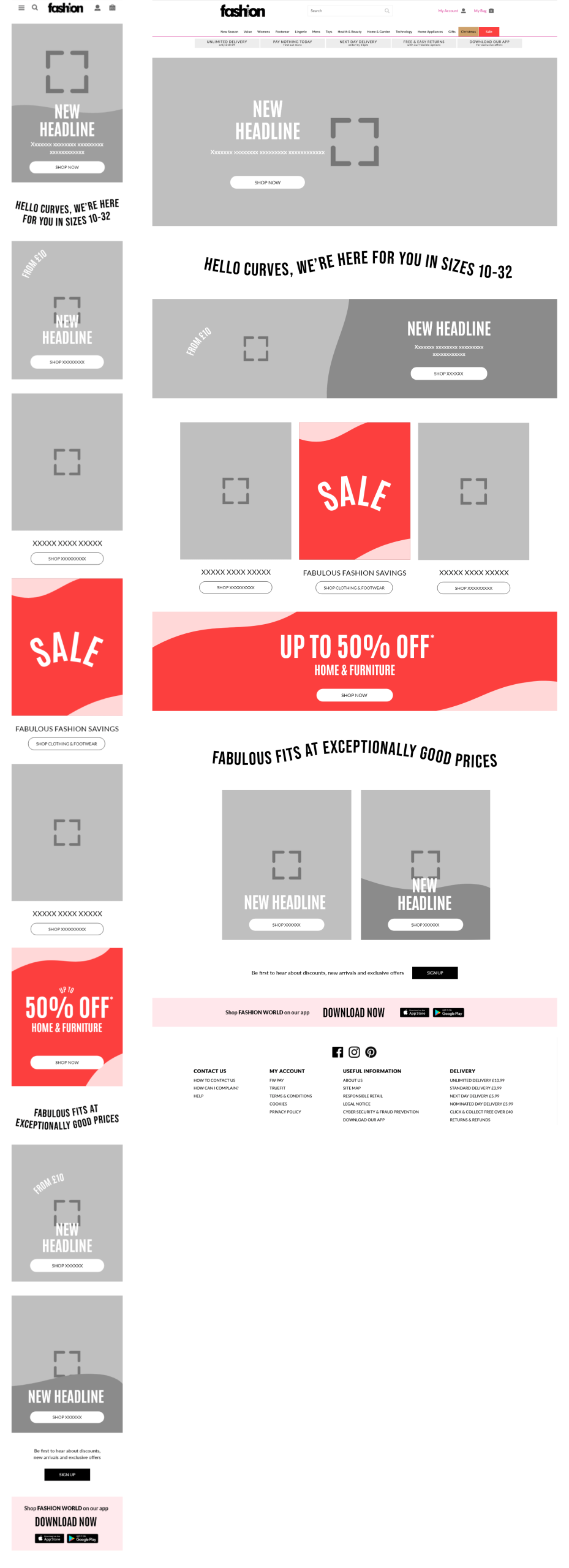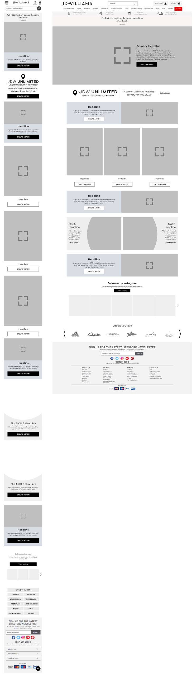 Developed foundational homepage wireframes for both Fashion World and JD Williams. While maintaining a consistent structural logic, the layouts were tailored to meet the specific customer needs of each brand, focusing on clear content hierarchy, navigation flow, and optimized product discovery.