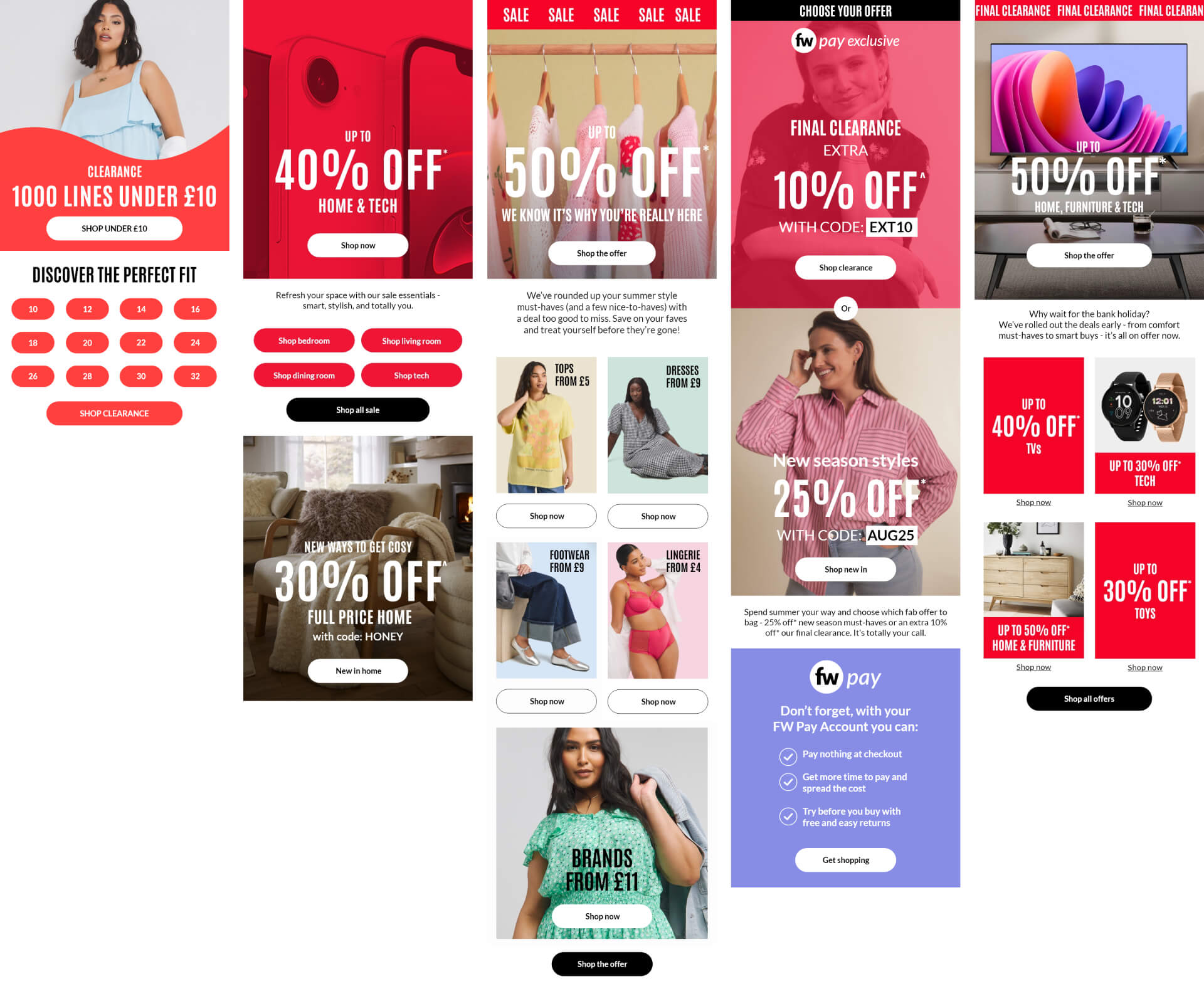 Designed and coded a series of mobile only sale layouts for Fashion World that focused on strong product price points and a clear visual hierarchy. These designs are a small selection of the extensive email design work I have produced, where the focus shifted toward bold typography and structured layouts following Jan 2025 brand updates. These layouts were built to drive performance and engagement during major clearance events.