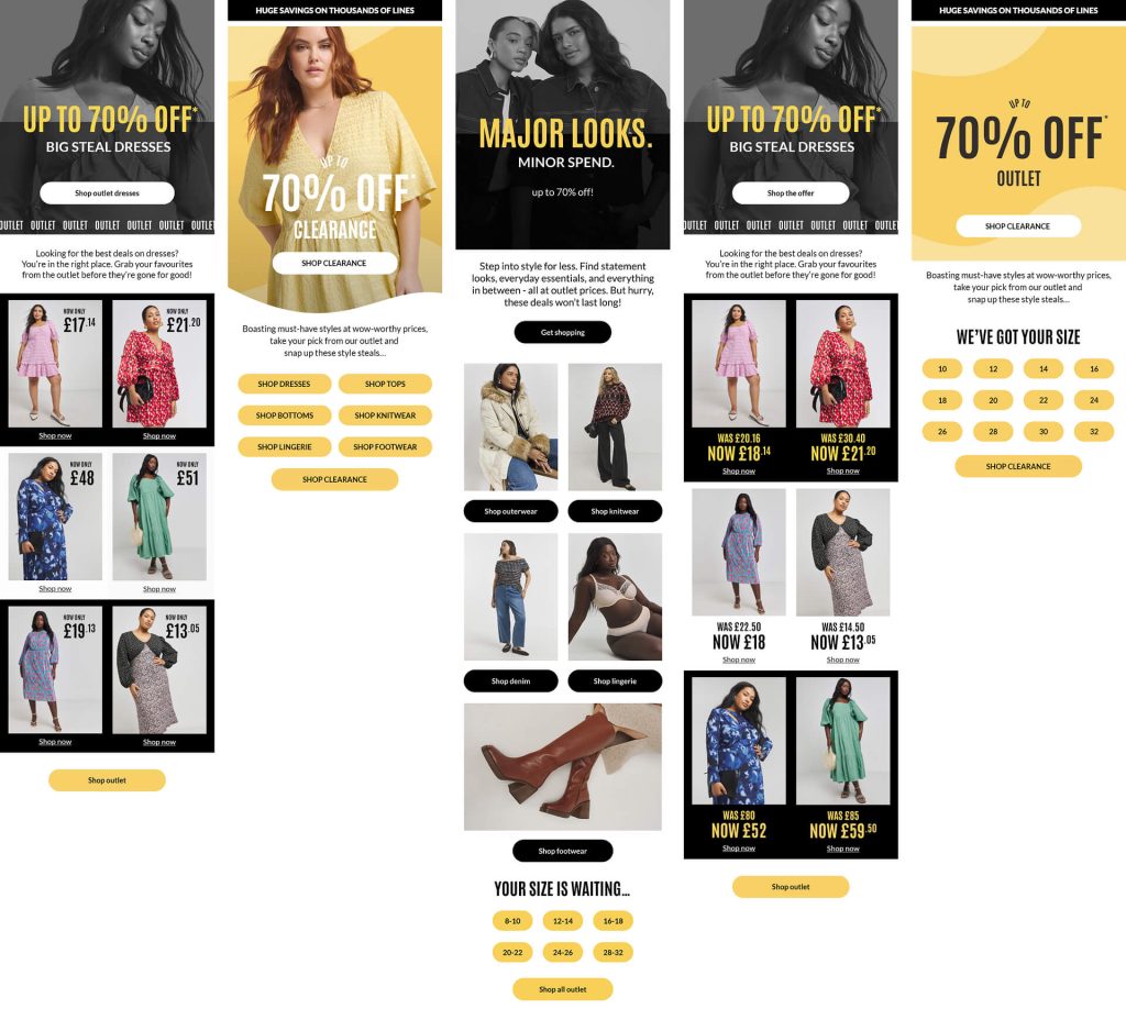 Developed mobile only email designs for the Fashion World Outlet, focusing on clean, product-led layouts. For these emails, I used e-com imagery from the website with a punch of colour behind and later the faded black overlay. The older designs in this series include the creative curved shapes, while the newer layouts transitioned into a black and yellow strong aesthetic to align with the evolving brand guidelines.